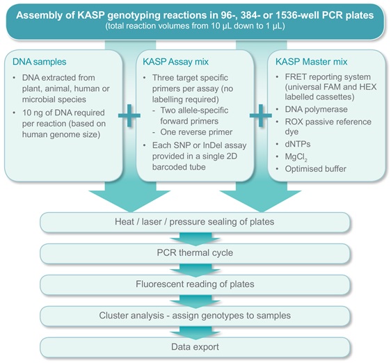 由于KASP實(shí)驗(yàn)方案的高度靈活性,其應(yīng)用也十分廣泛,適合于各種基因分型研究,無論是中低通量SNP研發(fā)項(xiàng)目,NGS之后的SNP驗(yàn)證,農(nóng)業(yè)種群研究,或者大量種子的生產(chǎn)QC和生物樣品庫 DNA Biobanking等都是其適用的范圍。