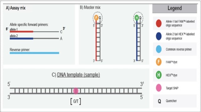 KASP技術(shù)原理上類似Taqman檢測,也是基于終端熒光讀取判斷,每孔采用雙色熒光檢測一個(gè)樣本的一個(gè)位點(diǎn)可能的兩種基因型,而KASP技術(shù)與Taqman技術(shù)不同的是,它不需要每個(gè)SNP位點(diǎn)都去合成特異的熒光引物,它基于自己獨(dú)特的ARM PCR原理,讓所有的位點(diǎn)檢測最終都使用通用熒光引物擴(kuò)增,這大大降低了LGC KASP的試劑成本,既有金標(biāo)準(zhǔn)的準(zhǔn)確,又降低了使用成本,比Taqman還具有更好的位點(diǎn)適應(yīng)性,所以在醫(yī)學(xué)、農(nóng)學(xué)檢測方面KASP都有非常好的應(yīng)用。