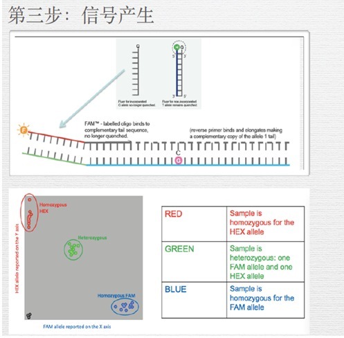 在一個(gè)含有測序酶,四種熒光標(biāo)記的ddNTP,緊挨多態(tài)位點(diǎn)5’端的不同長度延伸引物和PCR產(chǎn)物模板的反應(yīng)體系中,引物延伸一個(gè)堿基即終止,經(jīng)ABI測序儀跑膠后,根據(jù)峰的顏色可知摻入的堿基種類,從而確定該樣本的基因型,根據(jù)峰移動(dòng)的膠位置確定該延伸產(chǎn)物對(duì)應(yīng)的SNP位點(diǎn)。對(duì)于PCR產(chǎn)物模板可通過多重PCR反應(yīng)體系來獲得,通常用于6-30個(gè)SNP位點(diǎn)分析。