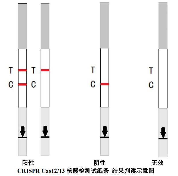 試紙條質控線(C 線)和檢測線(T 線)均出現(xiàn)紅色條帶;試紙條質控線(C 線)不顯色,檢測線(T 線)出現(xiàn)紅色條帶。上述兩種情況均說明 CRISPR/Cas 可進行有效切割,并激活報告基團顯色,結果均可判定為陽性。