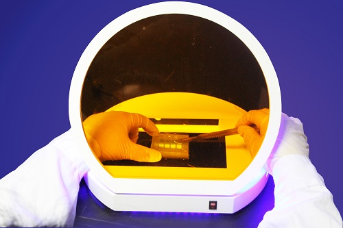 ● 將觀測儀放在凝膠電泳的電泳槽之上。打開開關(guān),熒光染料被激發(fā)而發(fā)光。透過橙紅色濾光板觀察樣品,在樣品還在電泳的時(shí)候就可以實(shí)時(shí)觀察。使用完成后,關(guān)閉電源開關(guān)。