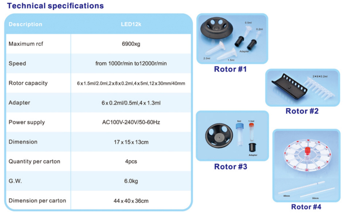 迷你高速離心機(jī),LED顯示,超靜音,轉(zhuǎn)速可調(diào),從1000rpm升至12000rpm,每1000rpm一個(gè)檔位,12個(gè)檔位,適合四種轉(zhuǎn)子(1.5ml,2ml,0.65ml)離心管,0.2八連排PCR管。