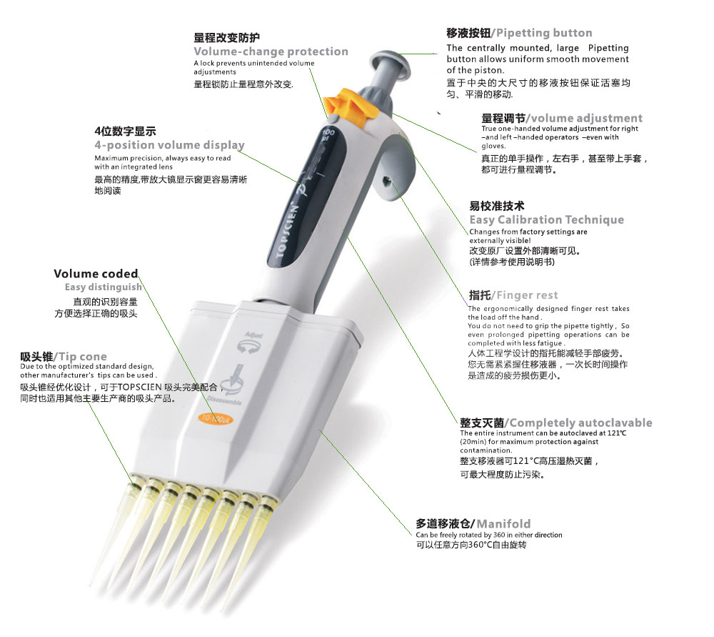中央移液按鈕、單手操作、精確的 4 位數(shù)字設(shè)置與顯示,用戶無論左手或右手操作均可輕松閱讀。這些僅僅是TOPSCIEN 可調(diào)移液器的眾多特色設(shè)計的一小部分。