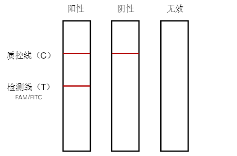 陽性結(jié)果表明樣本中含有待檢測的核酸片段,且其數(shù)量≥檢測卡的最低檢出量。當(dāng)目的核酸產(chǎn)物濃度較低時(shí),試紙條C線顯色呈紅色,T線呈淡紅色,甚至淺粉色條帶,該結(jié)果也應(yīng)判定為陽性。當(dāng)目的核酸產(chǎn)物濃度較高時(shí),試紙條C線顯色呈紅色,T線呈紅色,該結(jié)果也應(yīng)判定為陽性。