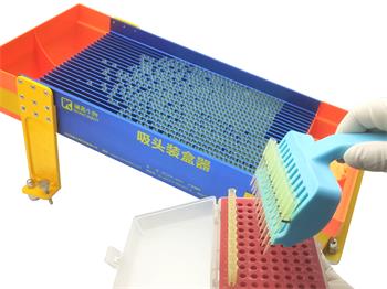 將吸頭倒入操作臺面上端,左右搖晃移液器裝盒器使吸頭通過斜置滑道進(jìn)使吸頭進(jìn)入各條卡槽內(nèi),再清沒有進(jìn)入槽入的吸頭;將后接料槽切換為接料模式,用12齒吸頭取出器從下接料托從下向上取出吸頭裝入吸頭盒,重復(fù)進(jìn)8次裝滿一盒;10ul白吸頭一次約可以裝4-8盒之間,黃吸頭約可以裝4-5盒之間(裝盒數(shù)量多少主要因素滑道里吸頭數(shù)量,重復(fù)添料次數(shù)。)