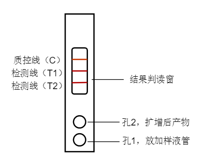 檢測卡出現(xiàn)質(zhì)控線(C)和檢測線(T1),都是紅色條帶,則靶標(biāo)1為陽性;