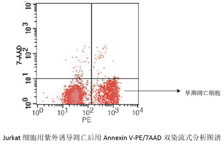 檢測管:處理的細(xì)胞,加Annexin V/PE,7AAD。用空白管和單陽管調(diào)節(jié)好電壓補(bǔ)償后,獲得所需要的流式數(shù)據(jù)。