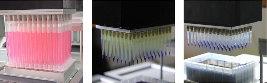 只需要用Medusa96高通量移液平臺(tái),以及溶液槽, 1個(gè)普通操作人員,輕松完成1000盤(pán)/天的工作量。